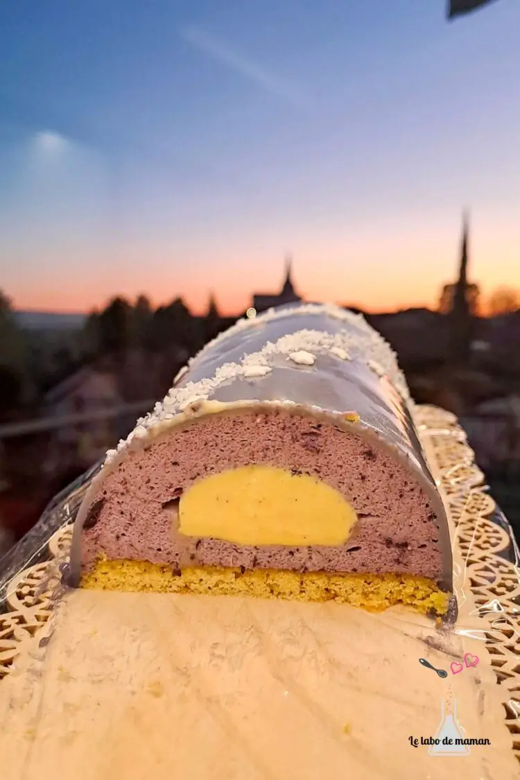 Coucou, Il est enfin venu le temps de vous dévoiler la bûche que j’ai réalisée l’année dernière. Il s’agit d’une bûche avec des myrtilles et un insert crémeux à la vanille. Elle est composée :